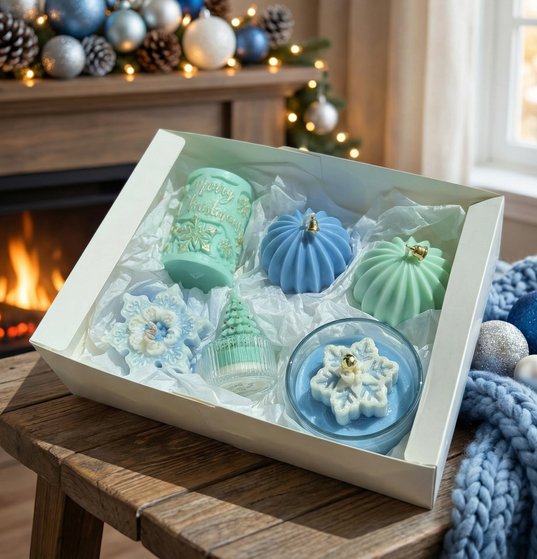 View ProductA 6-piece festive candle set in soft blue and mint tones, hand-poured in Brisbane and packed in a ready-to-gift box.