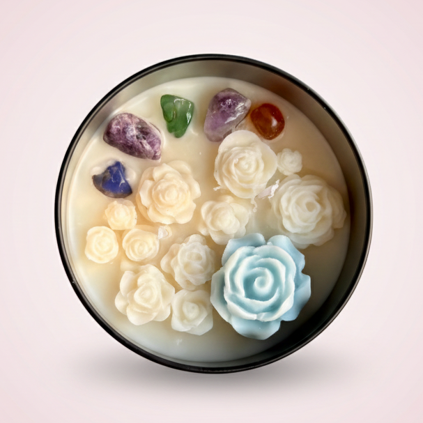 Hand-poured candles with flowers and real crystals, made for intention setting and...